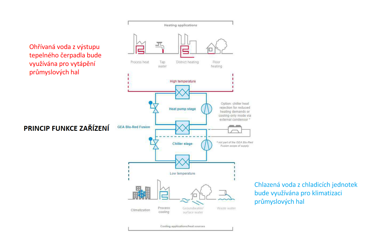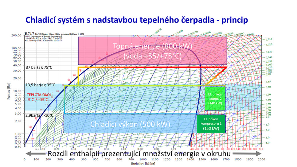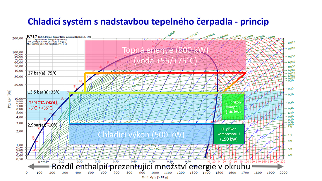 Pokud se toto teplo využije formou instalované nadstavby tepelného čerpadla, lze při příkonu dalšího kompresoru cca 140 kW získat teplo cca 800 kW při kondenzační teplotě chladiva +75°C. Teplota ohřáté vody může v tomto modelovém případě být např. +55/+75°C.